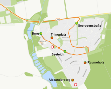 Aufgrund der Baumaßnahme können die Haltestellen „Alexanderberg“, „Raumeholz“ und „Thingplatz“ nicht bedient werden. Fahrgäste werden gebeten in dieser Zeit auf die Haltestellen „Seeteich“ und „Burg“ auszuweichen.