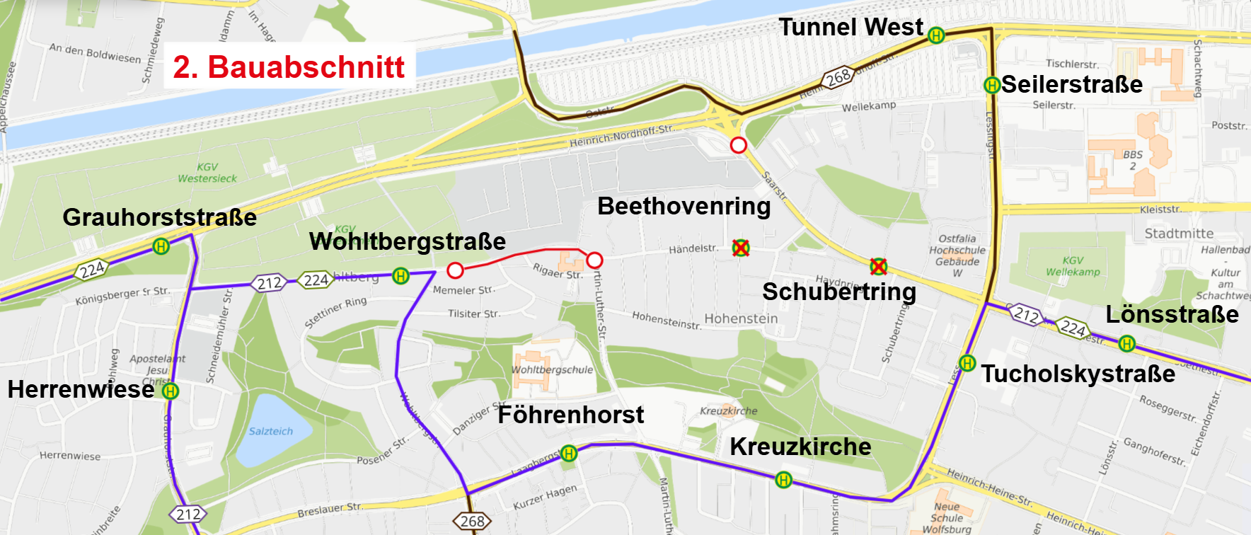 Alternativ werden die Haltestellen „Föhrenhorst“, „Kreuzkirche“ und „Tucholskystraße“ bedient.