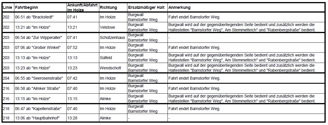 Die Haltestelle „Im Holze“ wird bis voraussichtlich 30. Januar 2026 ausgebaut und kann daher im Bauzeitraum nicht bedient werden. Betroffen sind einige Schulfahrten der Linien 202, 203, 204, 216, 218.