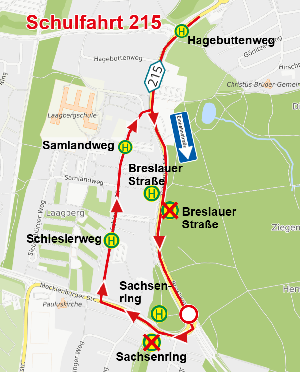 Die Schulfahrt der Linie 215 um 06:49 Uhr ab Waldhof Mitte bedient die Haltestellen ab Hagebuttenweg aufgrund der Einbahnstraßenregelung in umgekehrter Reihenfolge auf der gegenüberliegenden Straßenseite: