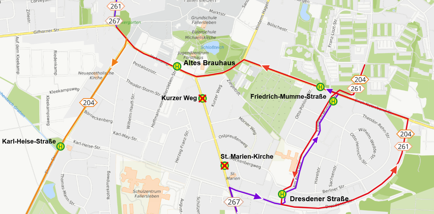 Für die Linie 204 Richtung Mörse und die Linie 261 Richtung Sülfeld wird ca. 20 m vor der regulären Haltestelle „Dresdener Straße“ eine Ersatzhaltestelle aufgestellt.
