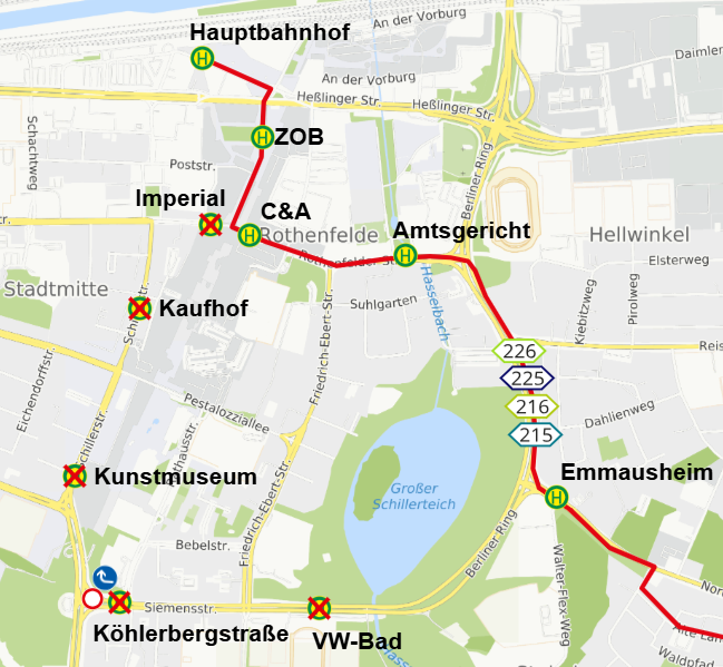 Ersatzweise werden die Haltestellen “Amtsgericht” und “C&A” in Richtung Hauptbahnhof bedient.