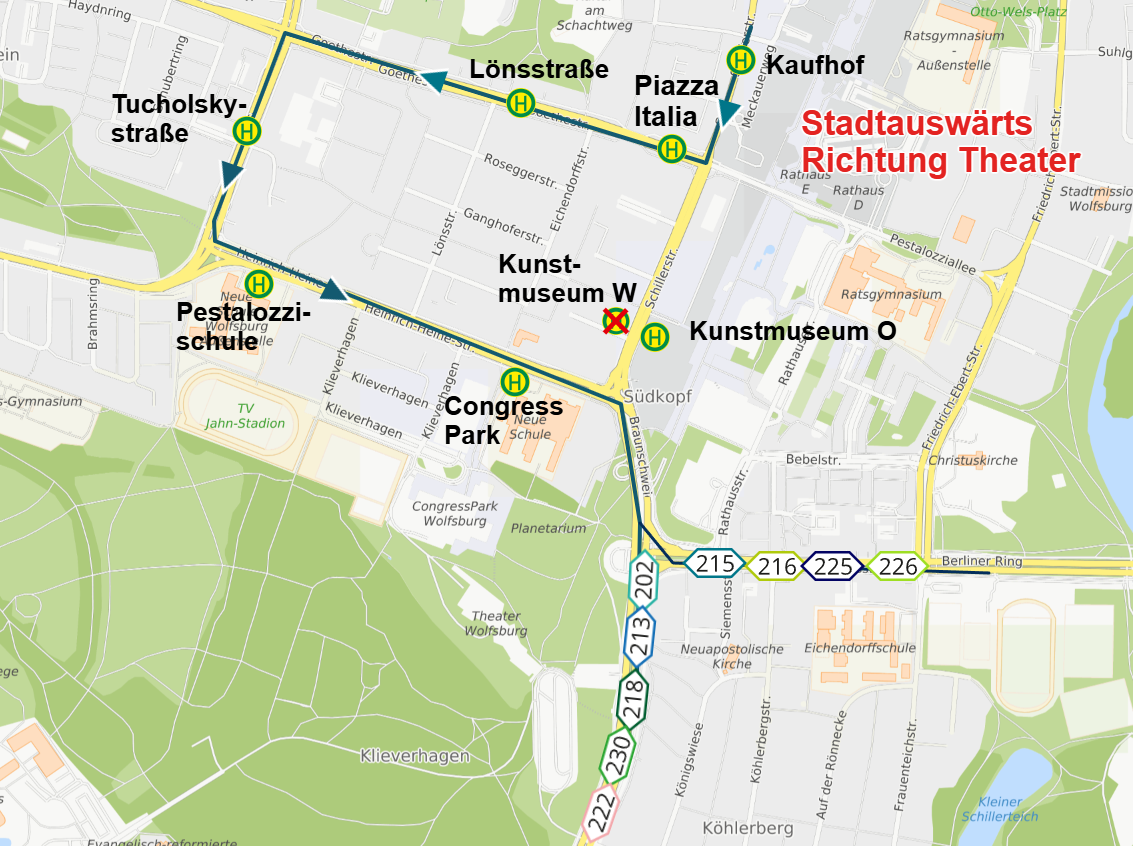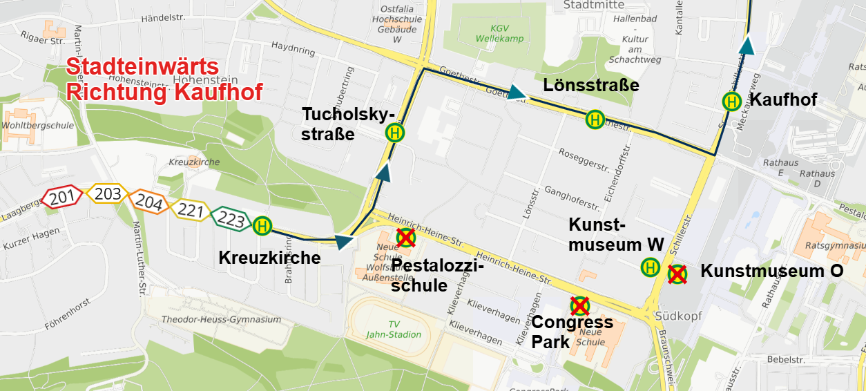 Die Busse können die Haltestelle „Kunstmuseum“ nicht anfahren und bedienen stattdessen die Haltestellen „Piazza Italia“, „Lönsstraße“, „Tucholskystraße“,„Pestalozzischule“ und „Congress Park“.